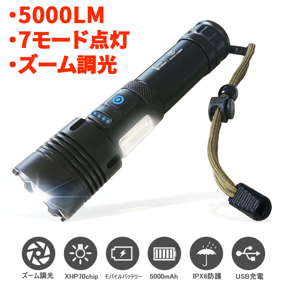 【6%OFFクーポン対象】最新モデル 懐中電灯 LED 超高輝度 ハンディライト 5000ルーメン 充電式 作業灯 7モード点灯 ズーム調光 強力 超明るい 防水 防塵 防災対策 モバイルバッテリー 26650電池付 防災 充電 乾電池